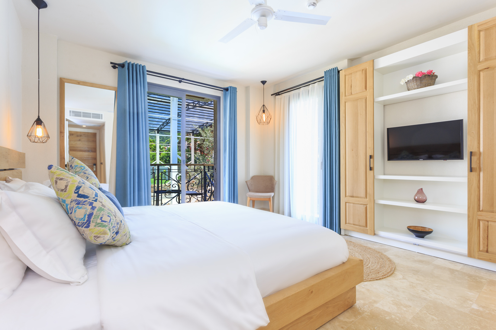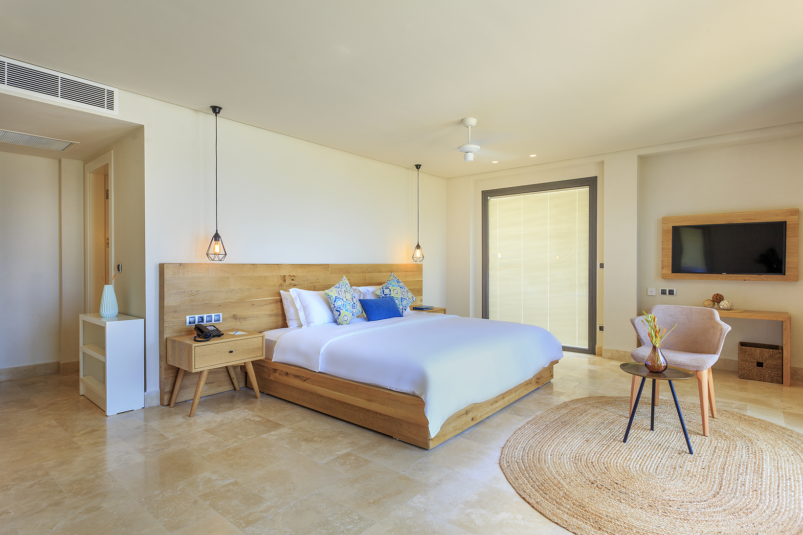 Doğal materyaller, mozaikler, mermer, keten kumaşlar gibi ham malzemelerin kullanımı ile rüstik bir görüntü sağlanırken, çağdaş sanat eserleri, tasarım objeler ve aksesuarlar gibi modern detaylarla uyumlu bir kontrast yaratmaktadır.