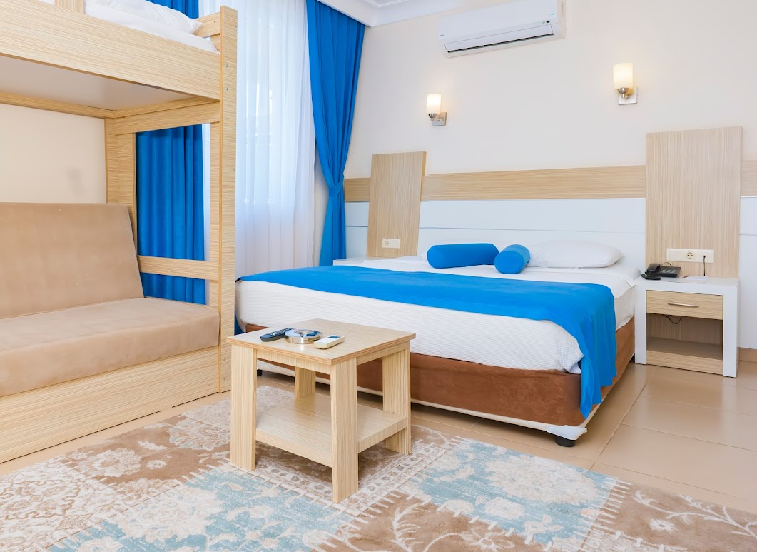 Grand Akca Deniz veya Havuz Manzaralı Oda, tesisimizin ön tarafında bulunan odalardır, büyüklüğü 32 metrekaredir. Deniz ve havuz manzarasına sahiptir. Bu odalarımızda bir adet 160 x 200 ebadında çift kişilik yatak, bir ranza ve bir adet tek kişilik yatak olabilen koltuk bulunmaktadır. Yine bu odalarımızda tv, mini bar, safe kasası, klima, saç kurutma makinesi, direk telefon bulunmaktadır. Deniz veya Havuz Manzaralı Oda ek yataksız 5 misafirimiz ağırlanabilmektedir.