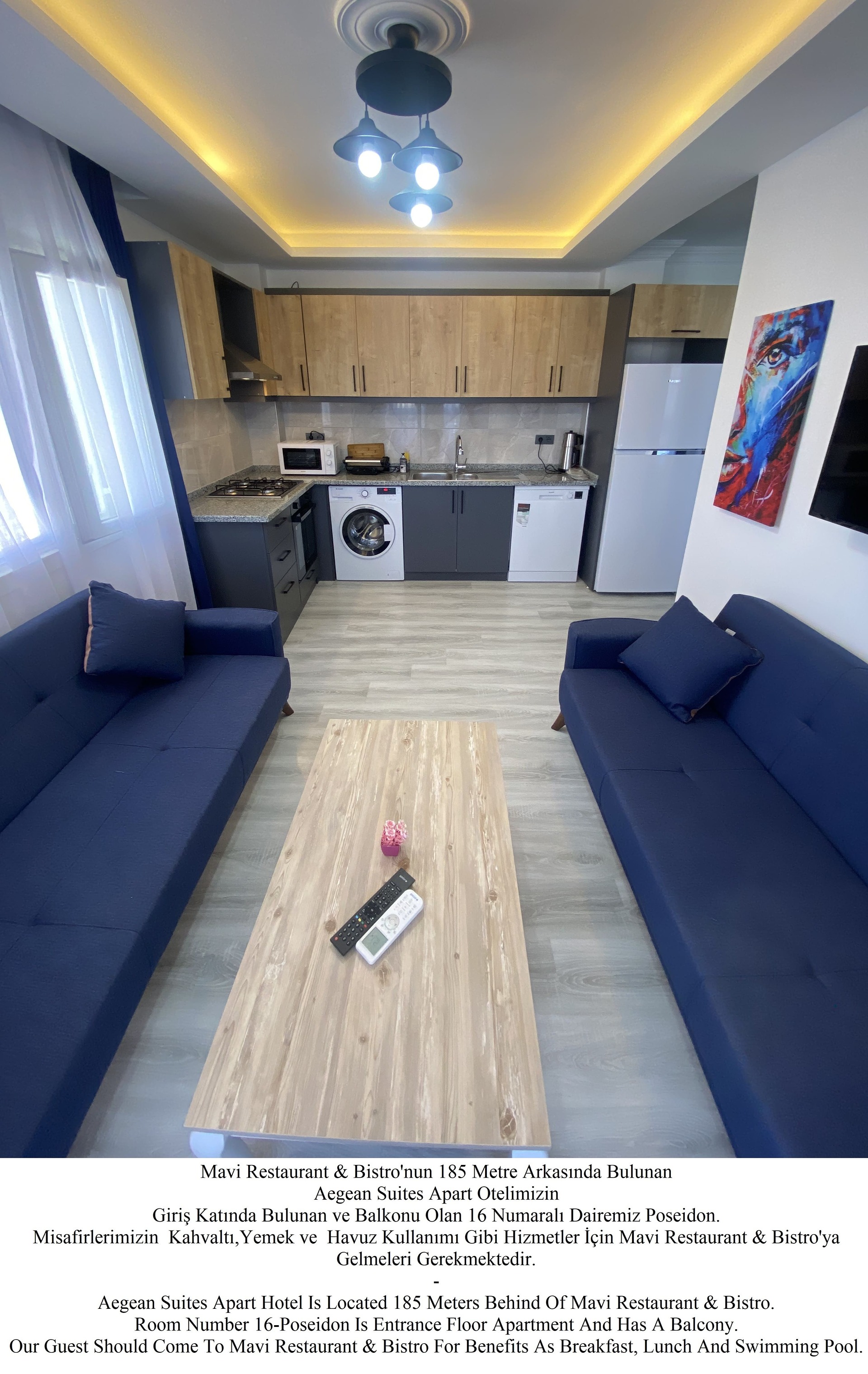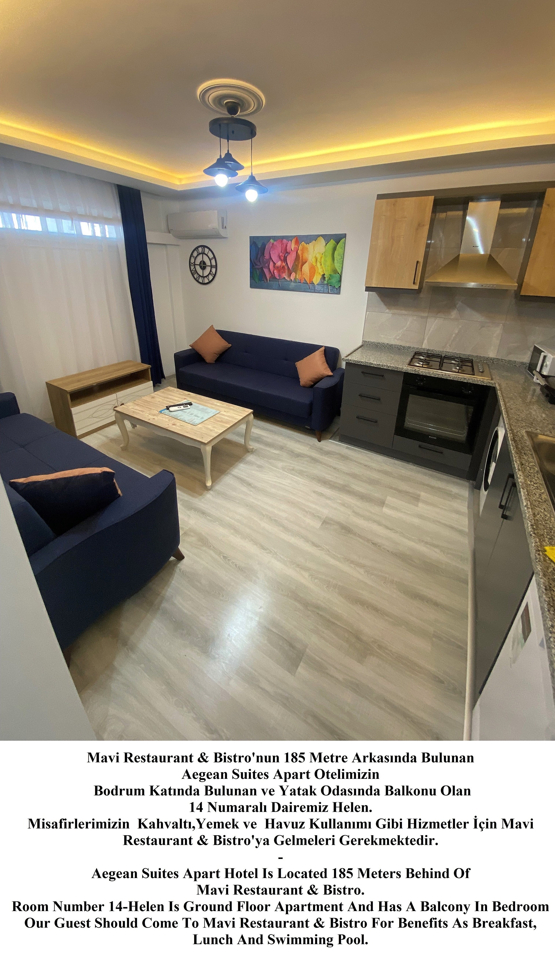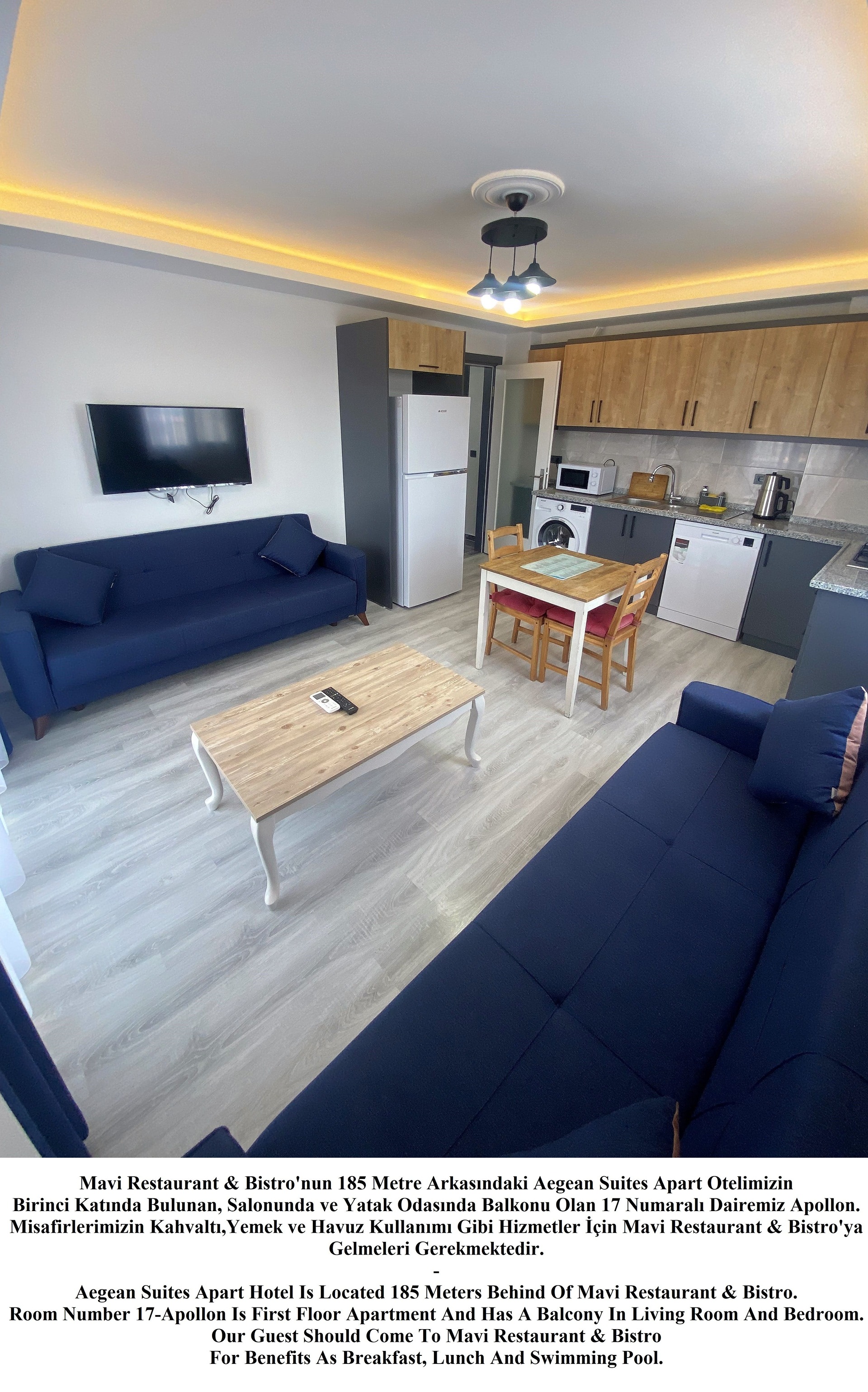 -Apart Daire Konseptlerimiz Restaurant ve Yüzme Alanı Dışarısında Olup Rezervasyon Yaptığınız Apart Daireye Göre 100 ila 200 Metre Yürüme Mesafesindedir. Apart Dairelerde Kalan Misafirlerimizin Tesis İmkanlarından Yararlanabilmek İçin Mavi Restaurant & Bistro’ya Gelmeleri Gerekmektedir. Apart Dairelerimizde Mutfak (Ankastre Ocak, Fırın, Mikrodalga Fırın, Tost Makinesi, Çaymatik, Çamaşır Makinesi, Çamaşır Kurutma Teli, Bulaşık Makinesi, Ütü, Ütü Masası, Saç Kurutma Makinesi, Havlu ve Banyo Ürünleri Mevcuttur.