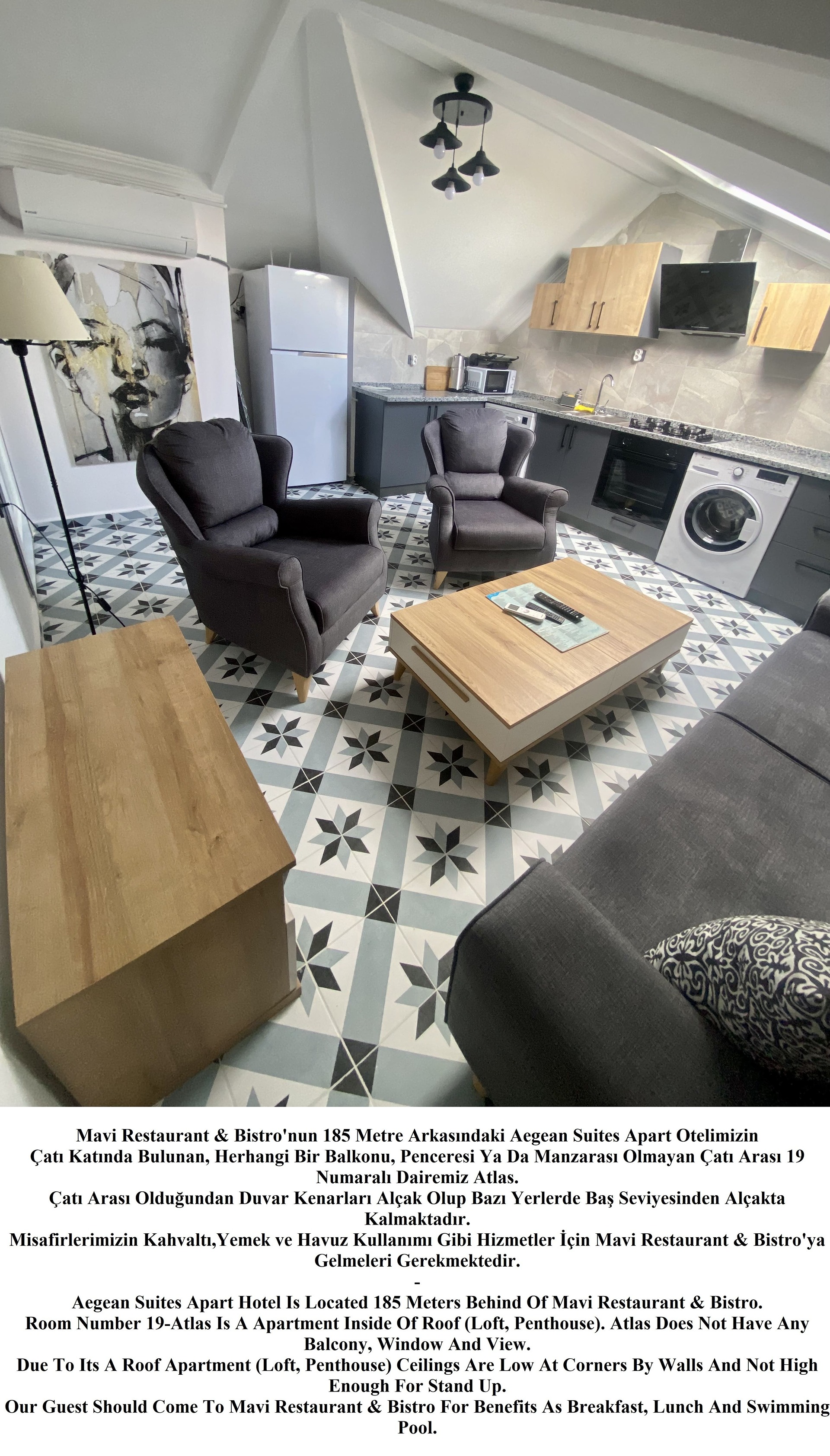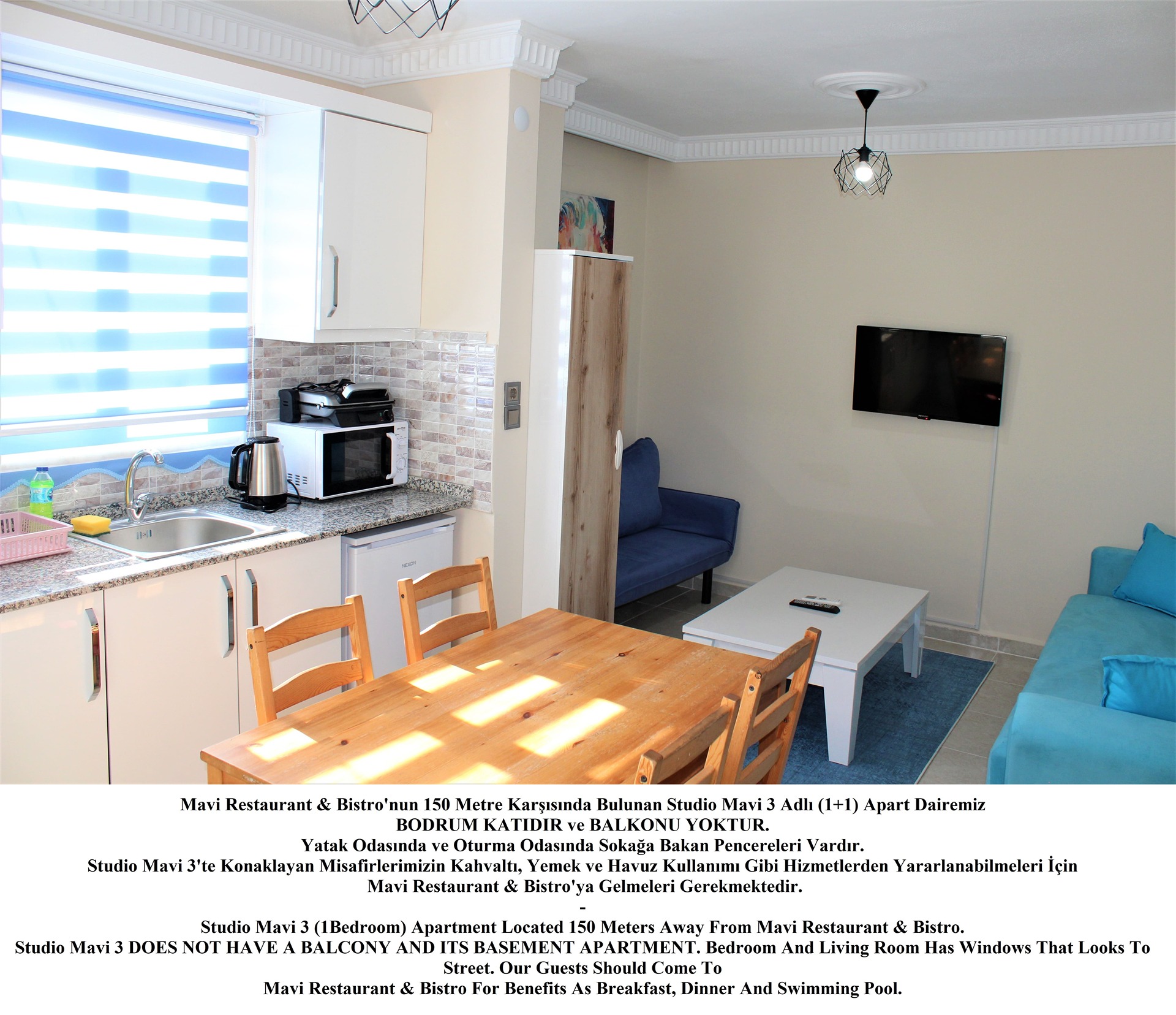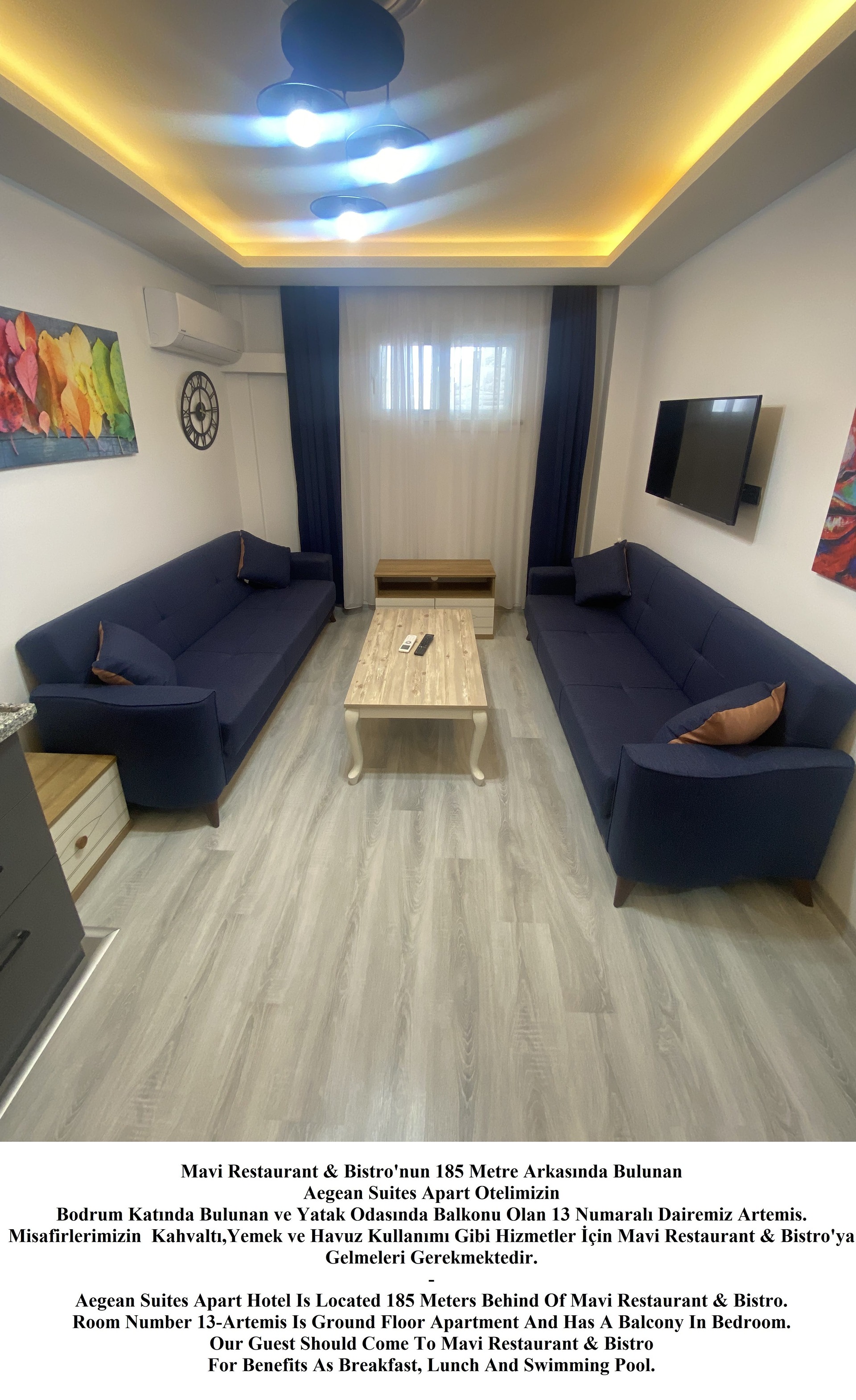 -Apart Daire Konseptlerimiz Restaurant ve Yüzme Alanı Dışarısında Olup Rezervasyon Yaptığınız Apart Daireye Göre 100 ila 200 Metre Yürüme Mesafesindedir. Apart Dairelerde Kalan Misafirlerimizin Tesis İmkanlarından Yararlanabilmek İçin Mavi Restaurant & Bistro’ya Gelmeleri Gerekmektedir. Apart Dairelerimizde Mutfak (Ankastre Ocak, Fırın, Mikrodalga Fırın, Tost Makinesi, Çaymatik, Çamaşır Makinesi, Çamaşır Kurutma Teli, Bulaşık Makinesi, Ütü, Ütü Masası, Saç Kurutma Makinesi, Havlu ve Banyo Ürünleri Mevcuttur.
