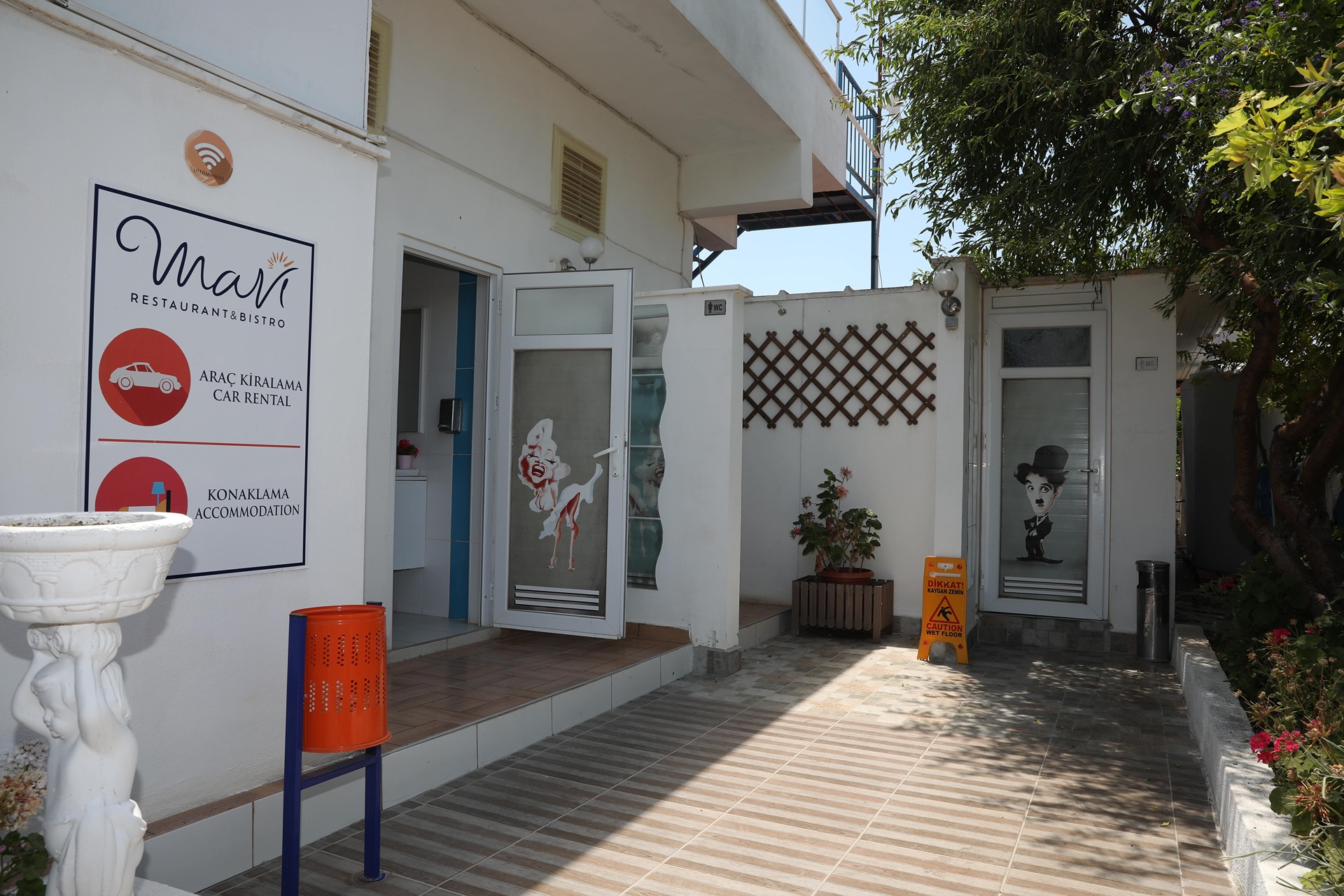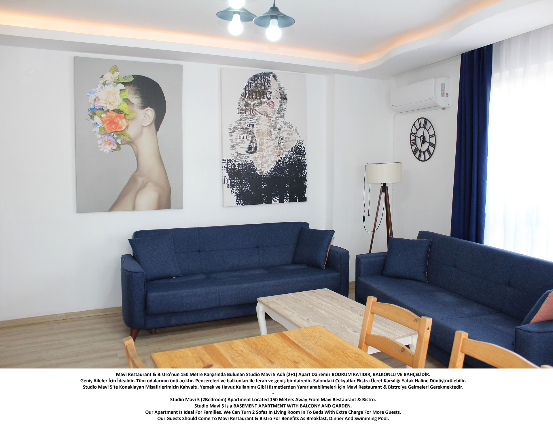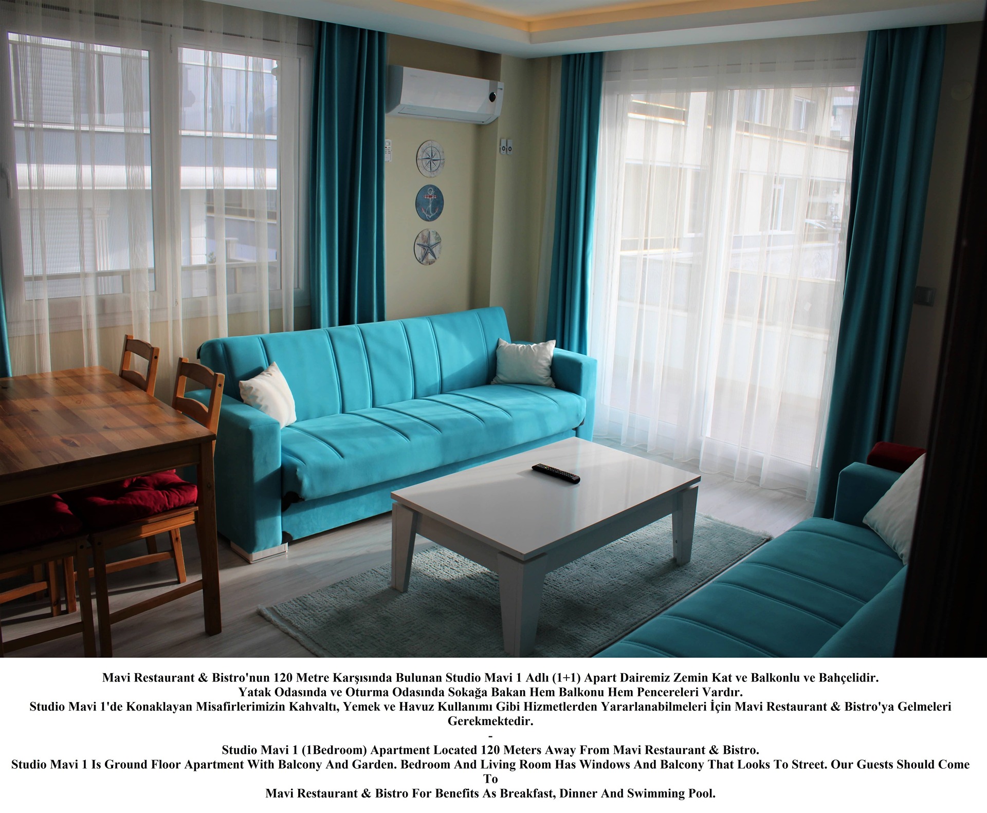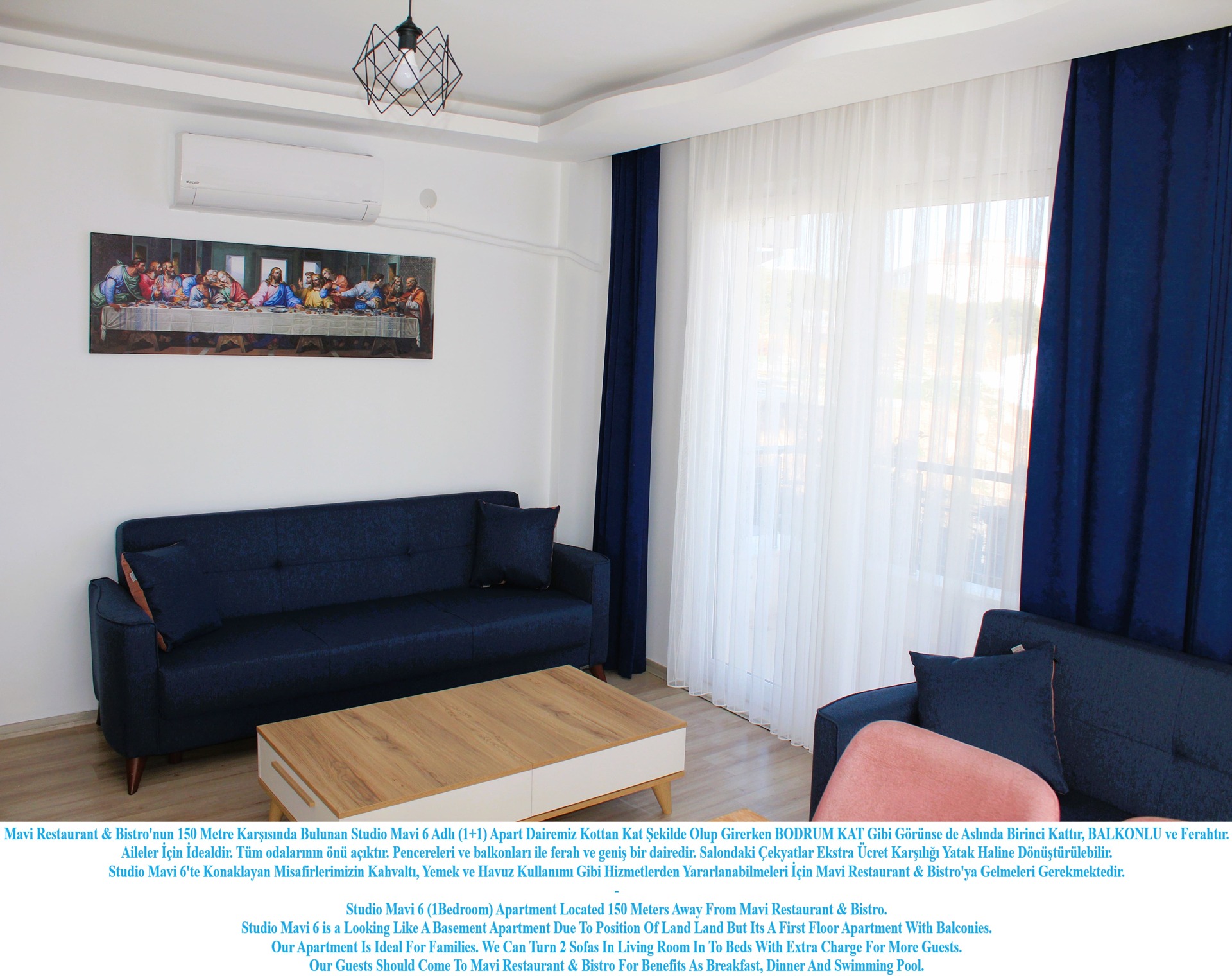 Mavi Restaurant & Bistro; Restaurant Hizmetinin Yanında Apart Daire ve Otel Odası Konseptinde Konaklama Hizmeti Vermektedir. Tüm Konaklamalarda Fiyatlandırmamız Kişi Sayısına Göre Yapılmaktadır. Restaurant Alanı İçerisinde Bulunan Ofisimiz Resepsiyon Olarak Kullanılmaktadır.
