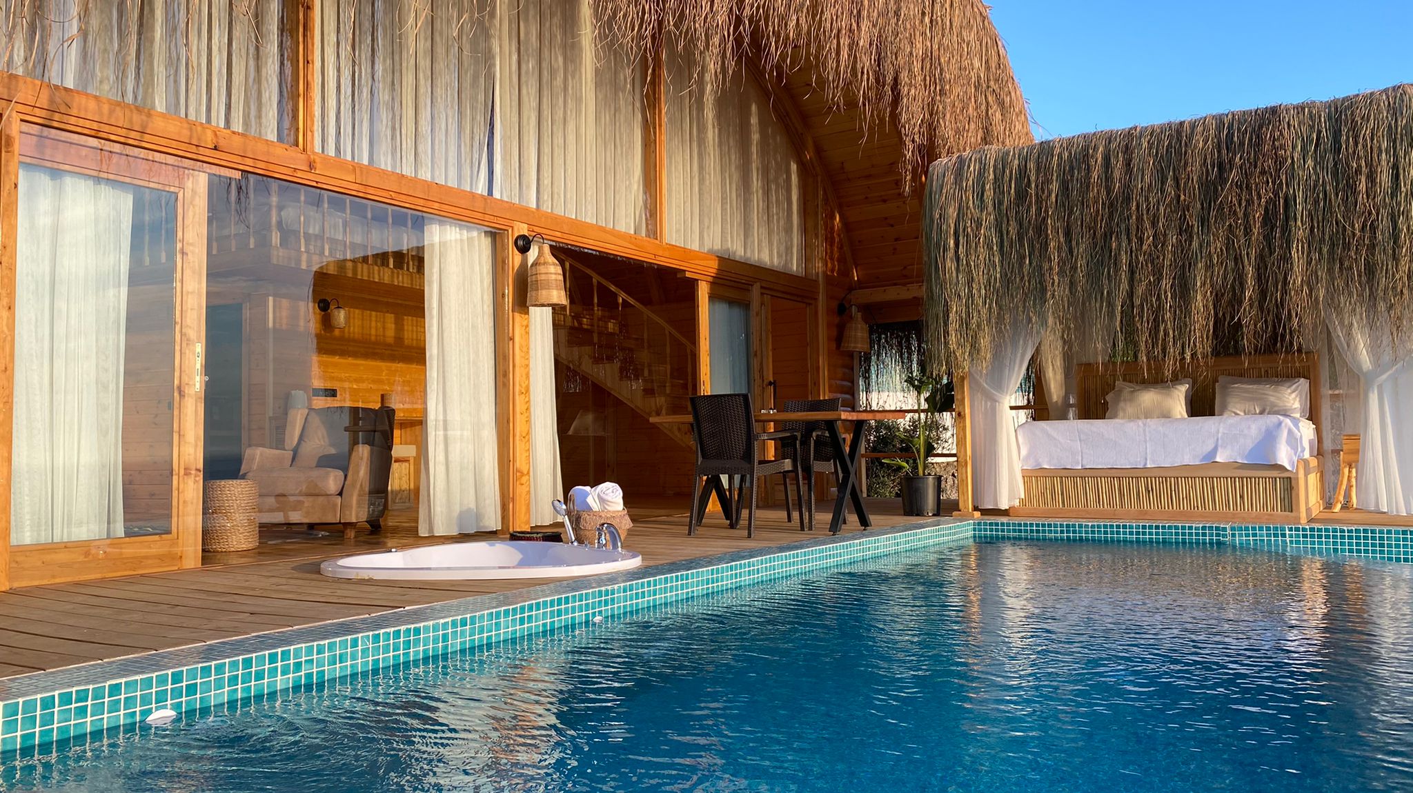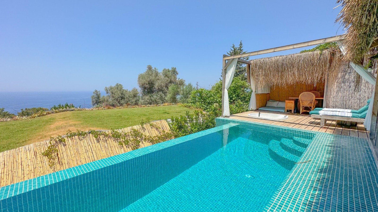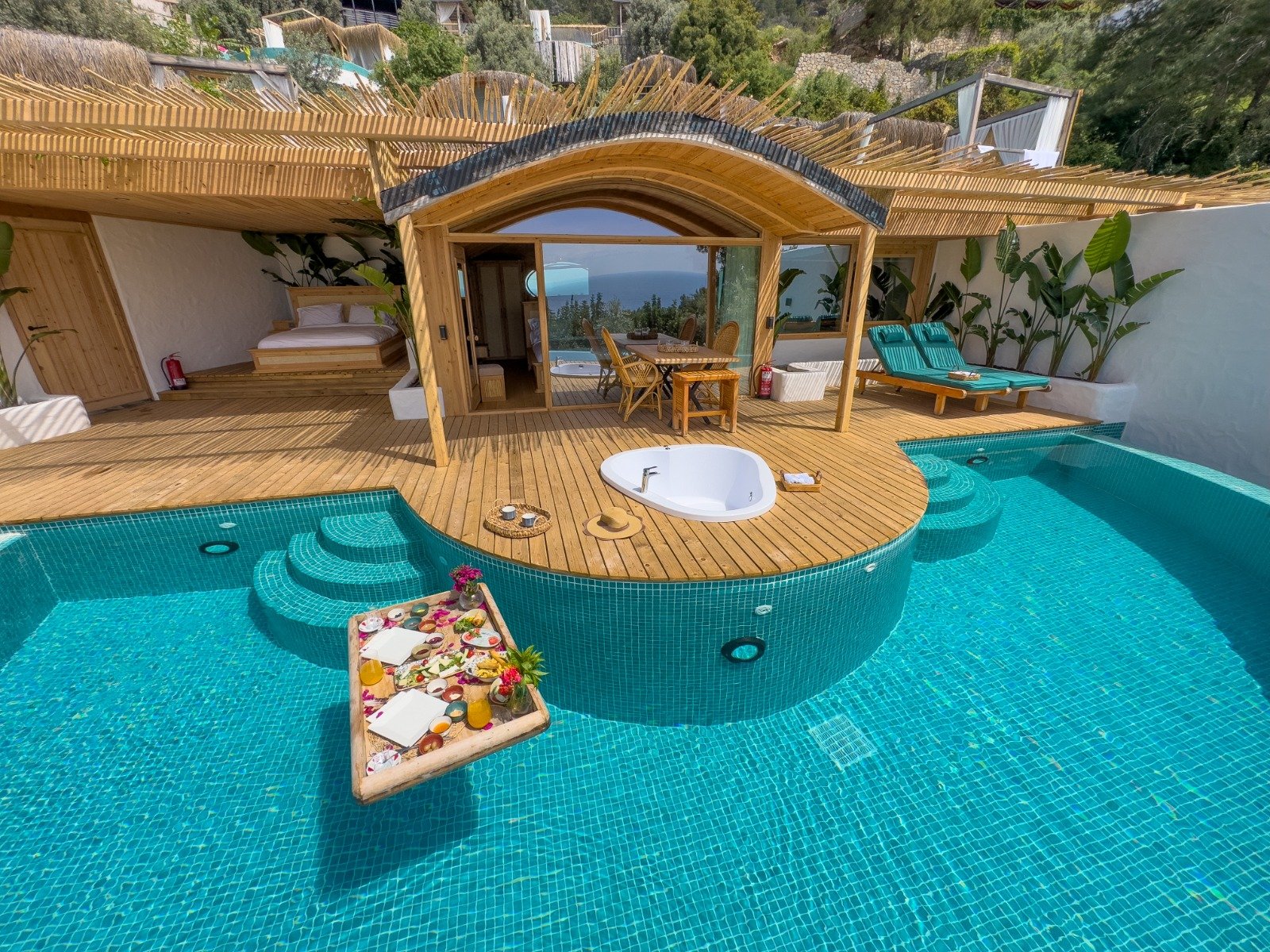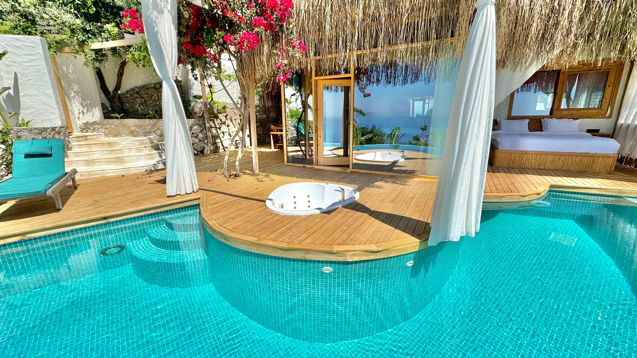 🌿Lavanta full deniz manzaralı, özel havuzlu ve jakuzili, içten asma katlı dubleks bir odadır. Diğer odalardan farklı olarak içerisinde akıllı TV ve oturma alanı mevcuttur, tavan yüksekliği 6 metredir, havuz başında etrafı tüllerle çevrili dış yatağı vardır ☘️