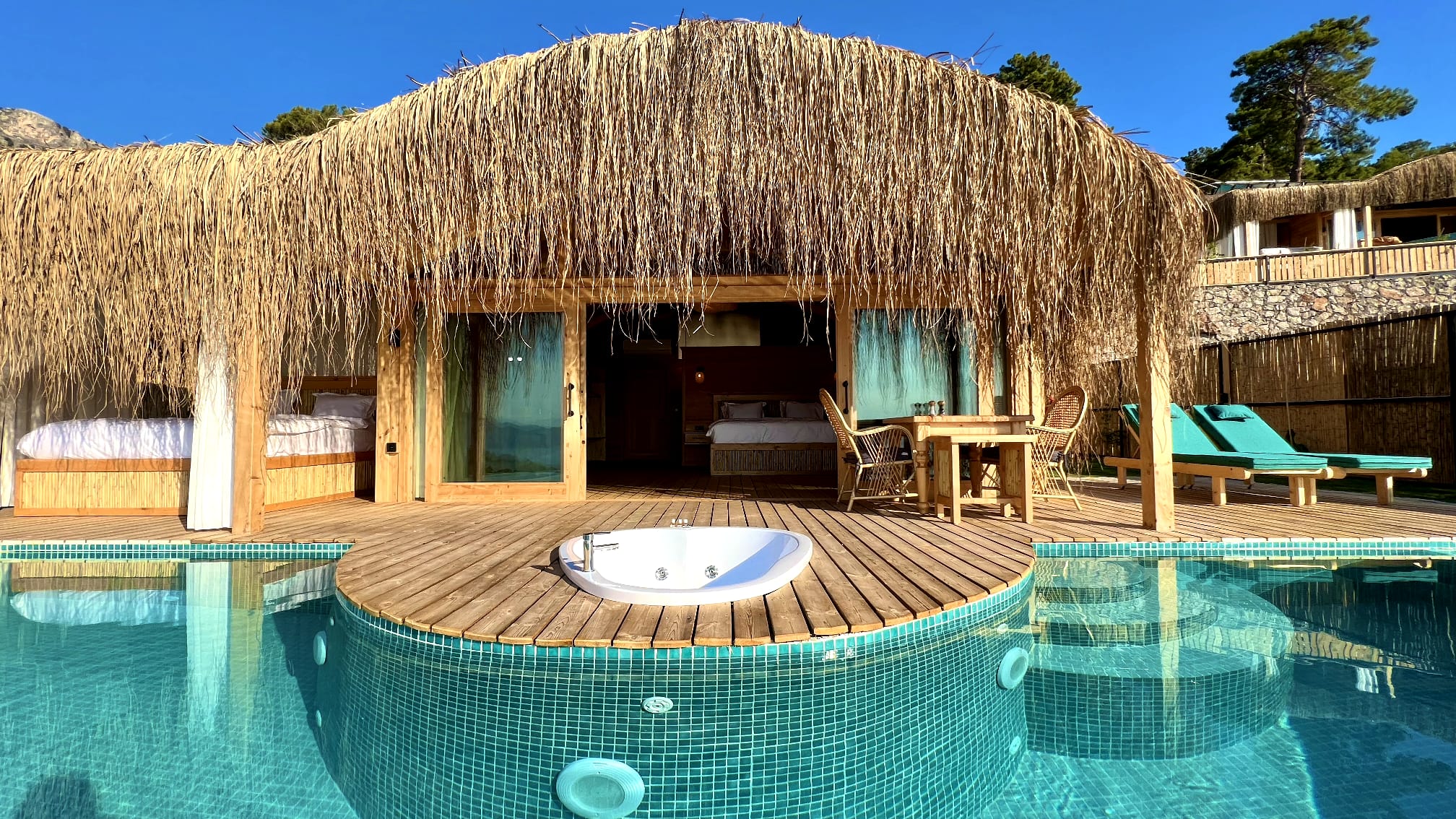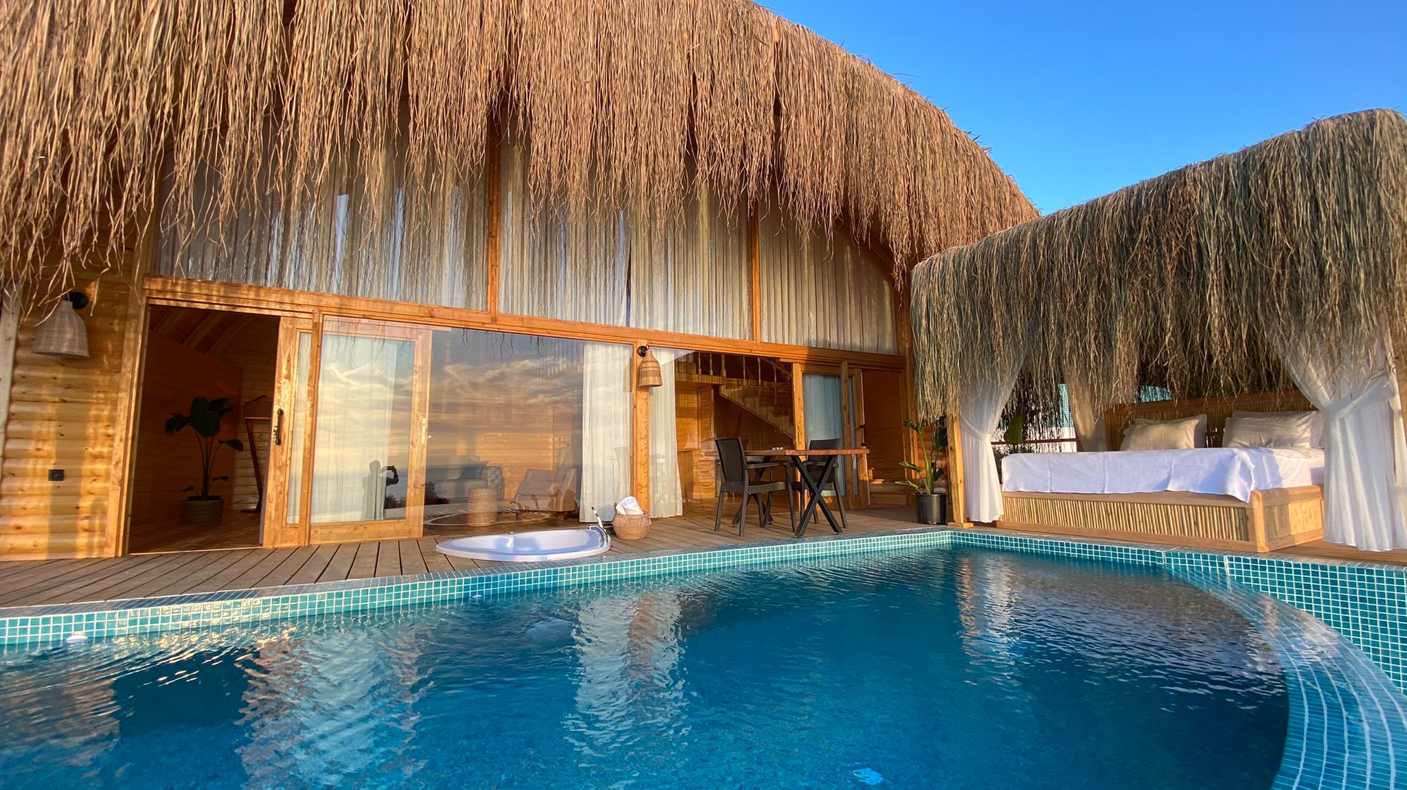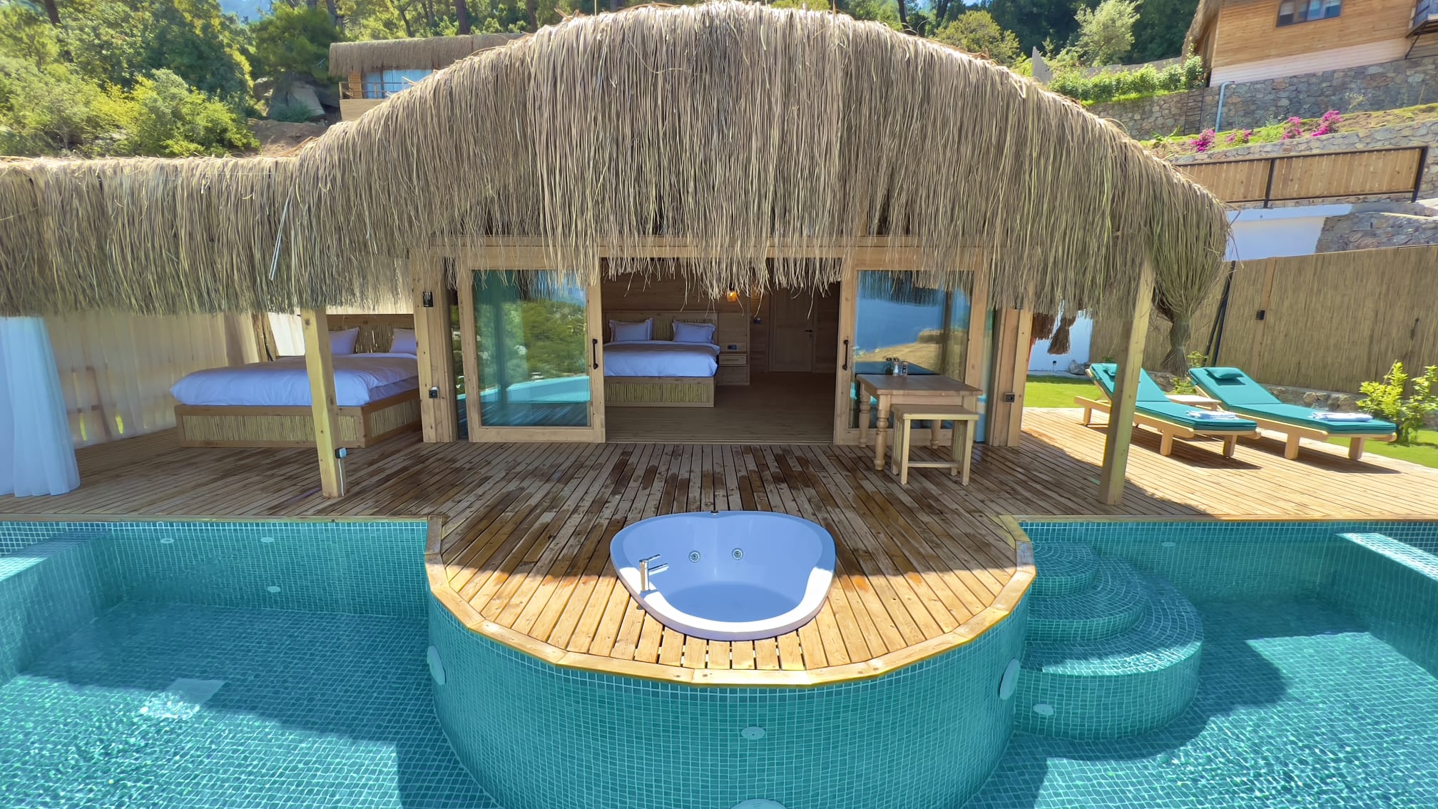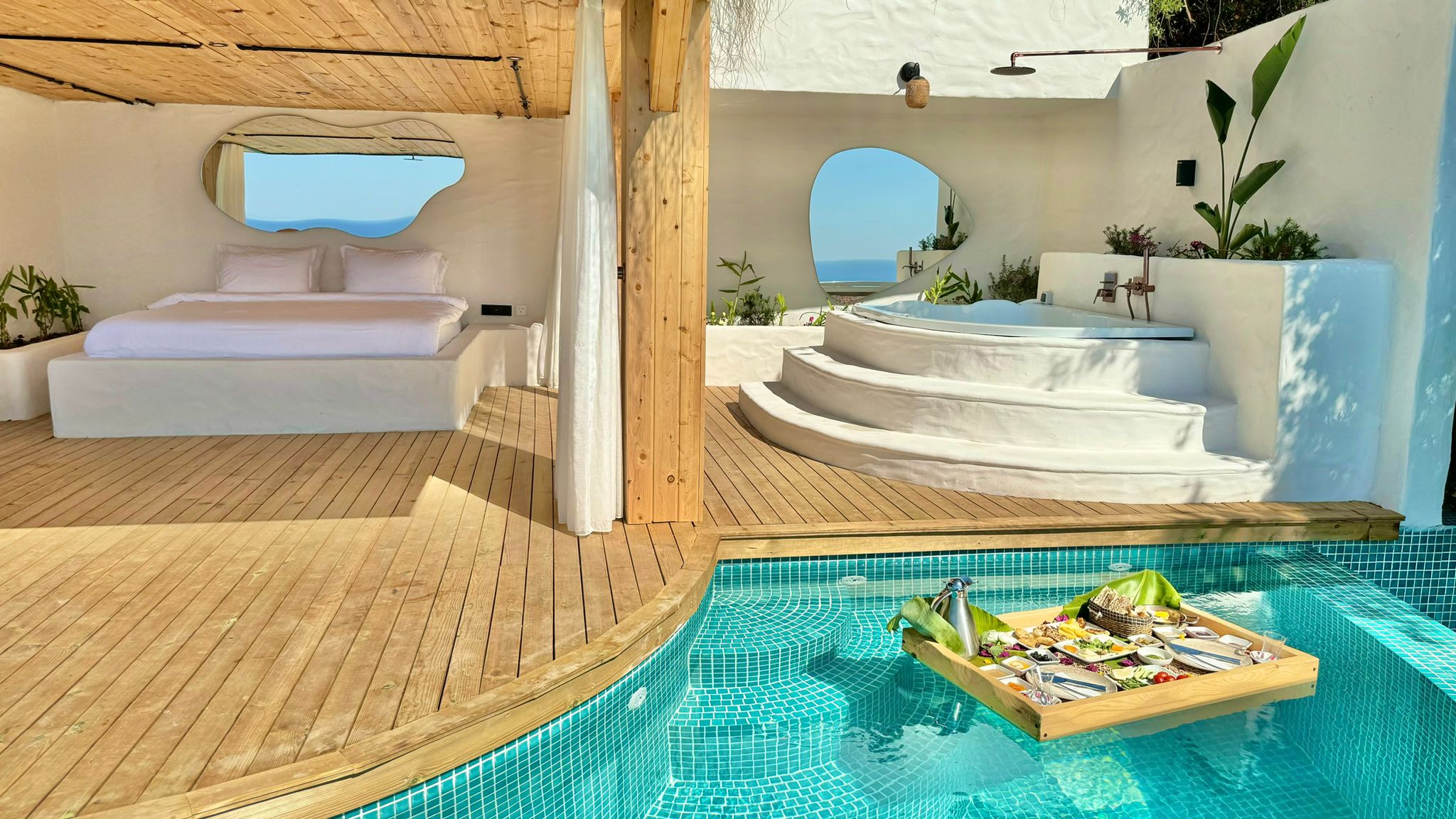 🌿Lavanta full deniz manzaralı, özel havuzlu ve jakuzili, içten asma katlı dubleks bir odadır. Diğer odalardan farklı olarak içerisinde akıllı TV ve oturma alanı mevcuttur, tavan yüksekliği 6 metredir, havuz başında etrafı tüllerle çevrili dış yatağı vardır ☘️