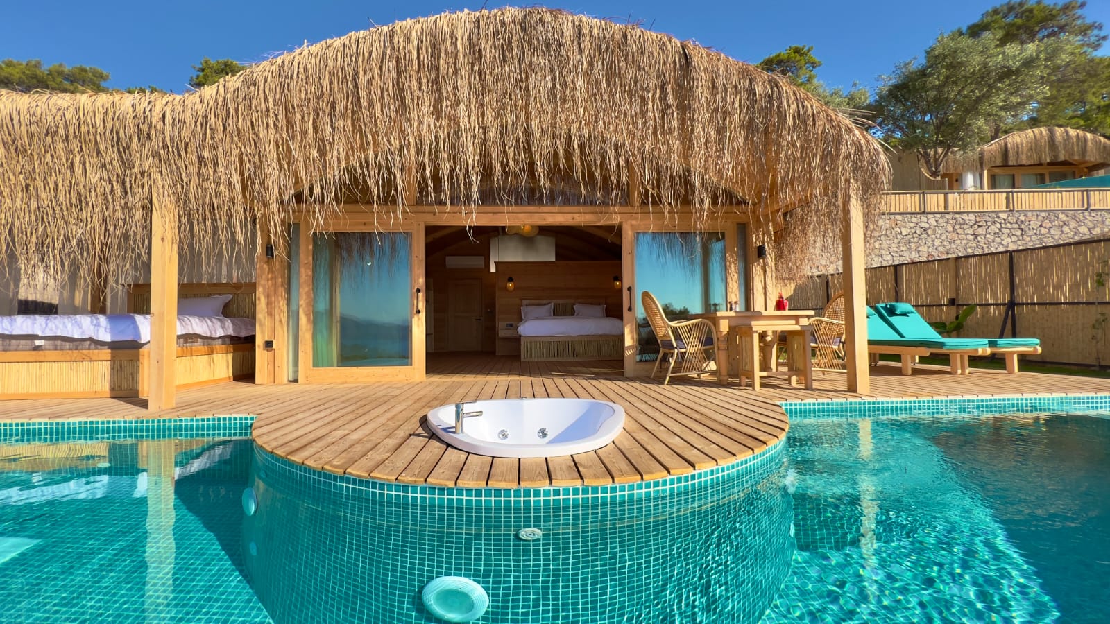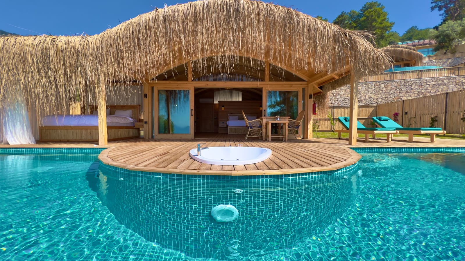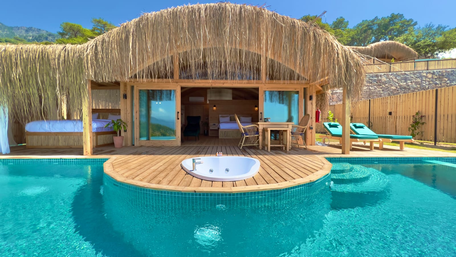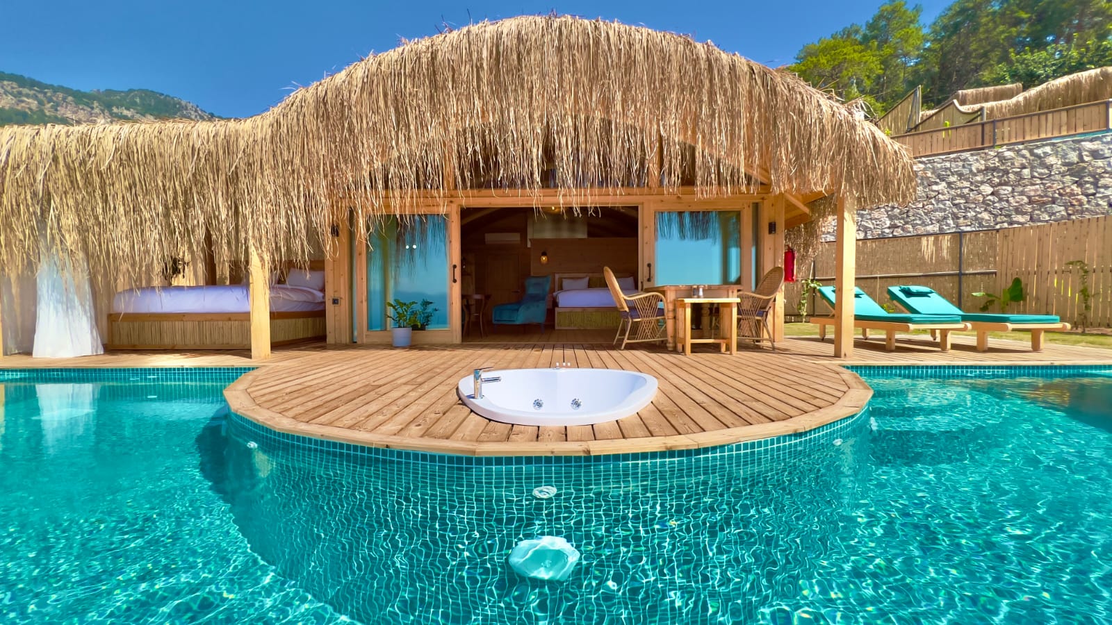 🌿Lavanta full deniz manzaralı, özel havuzlu ve jakuzili, içten asma katlı dubleks bir odadır. Diğer odalardan farklı olarak içerisinde akıllı TV ve oturma alanı mevcuttur, tavan yüksekliği 6 metredir, havuz başında etrafı tüllerle çevrili dış yatağı vardır ☘️