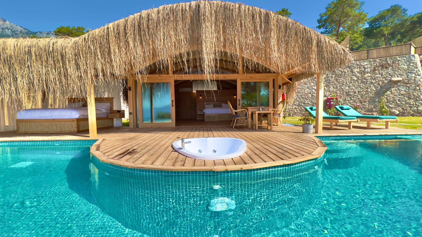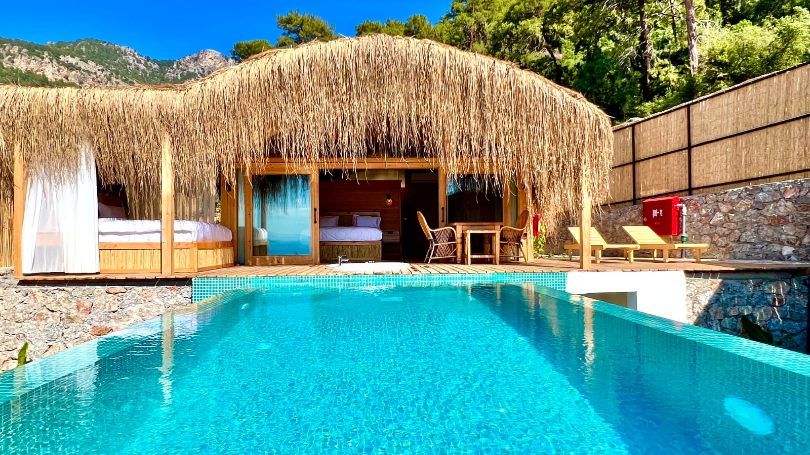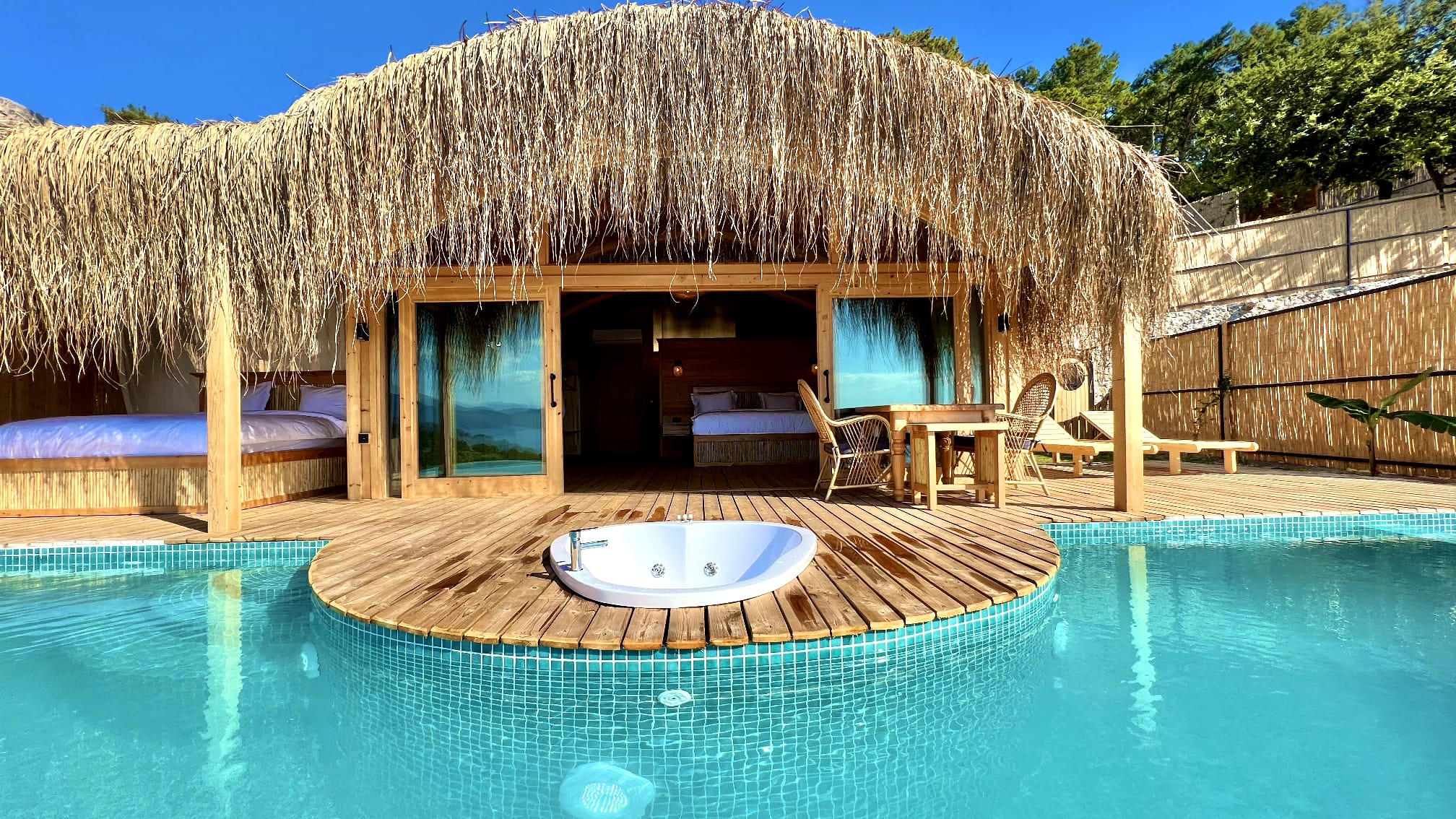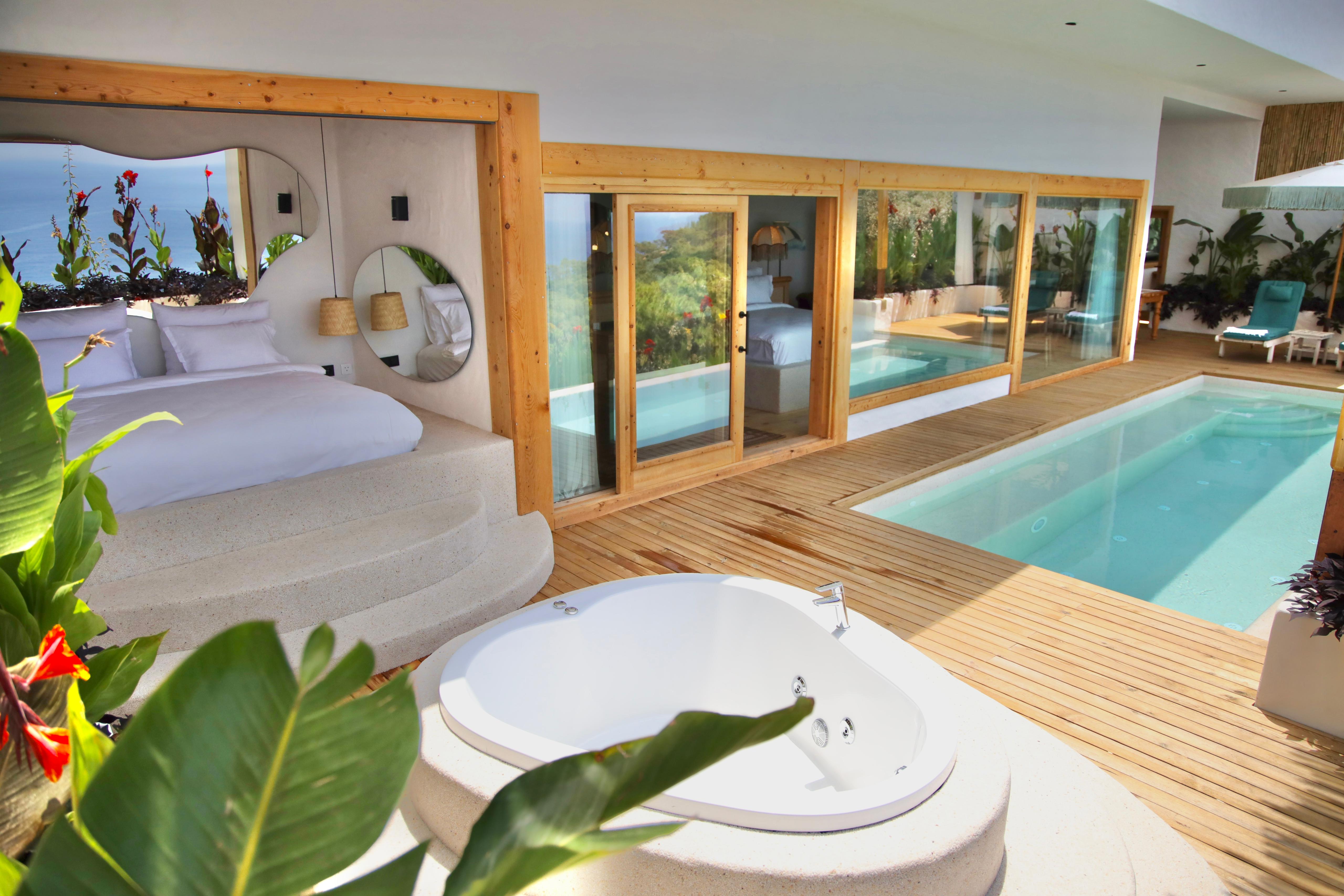 🌿Lavanta full deniz manzaralı, özel havuzlu ve jakuzili, içten asma katlı dubleks bir odadır. Diğer odalardan farklı olarak içerisinde akıllı TV ve oturma alanı mevcuttur, tavan yüksekliği 6 metredir, havuz başında etrafı tüllerle çevrili dış yatağı vardır ☘️