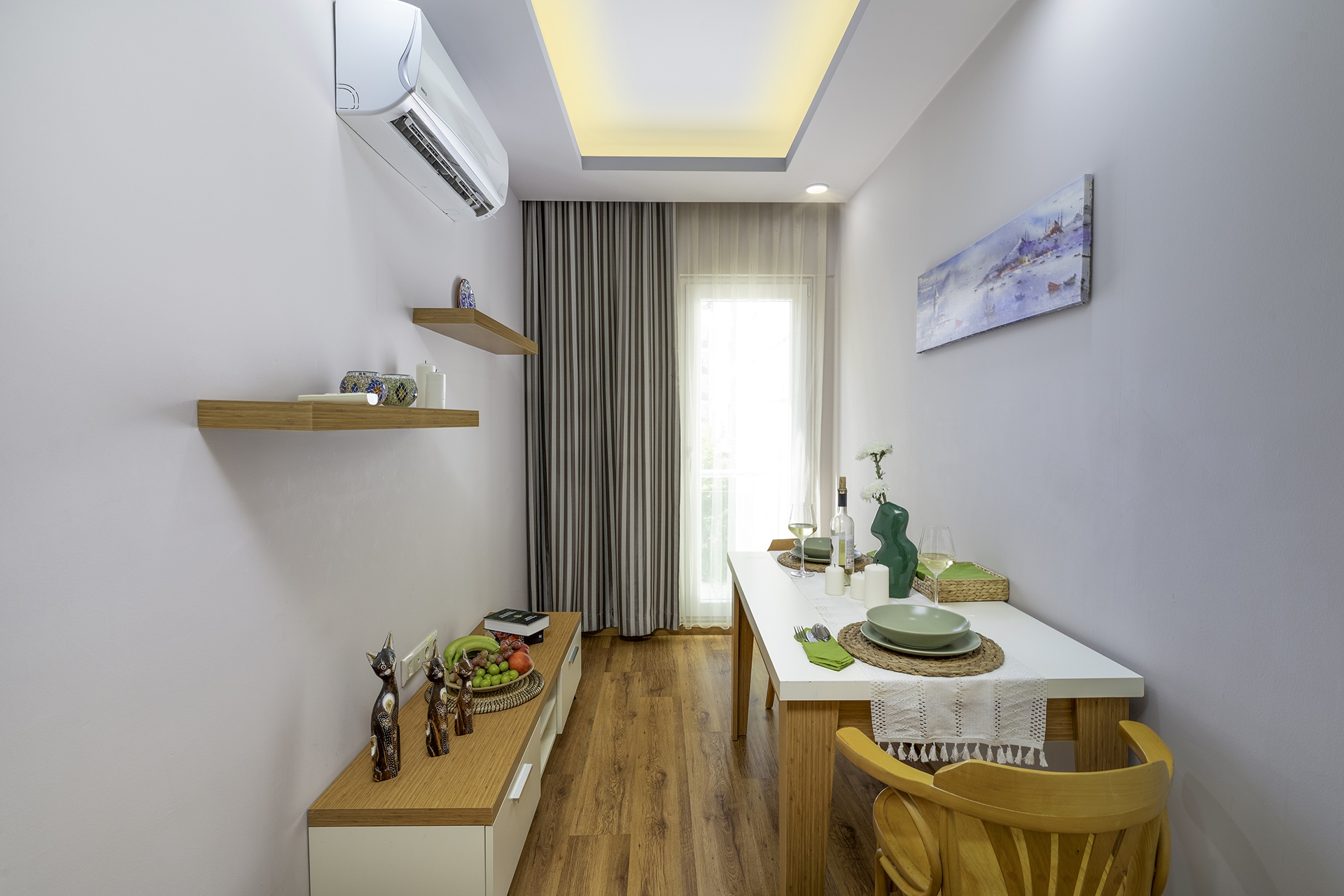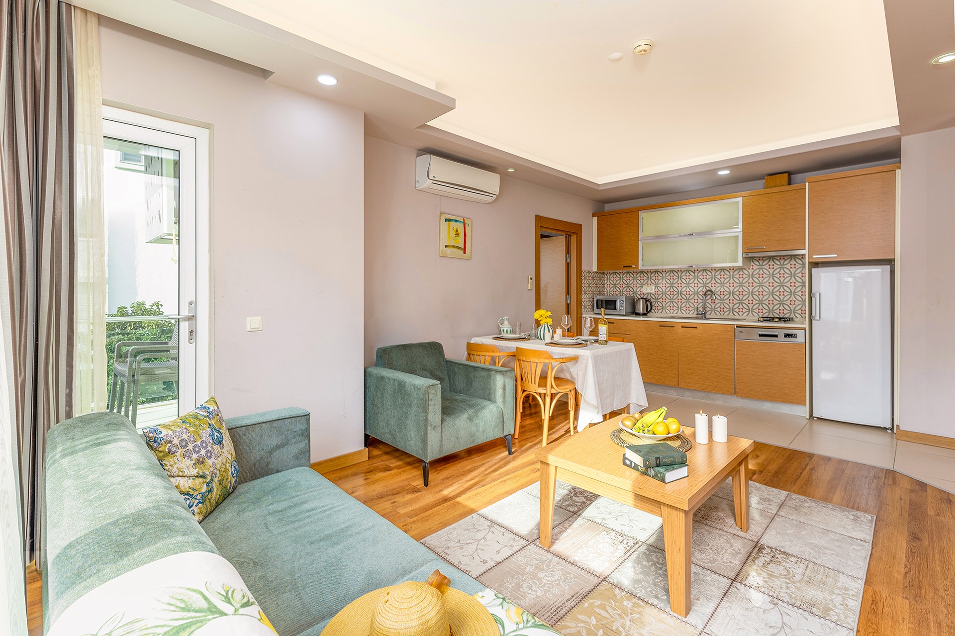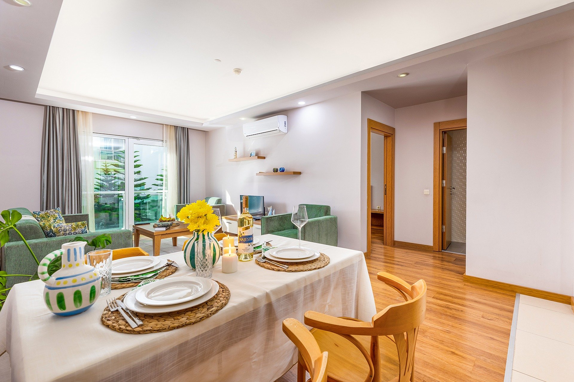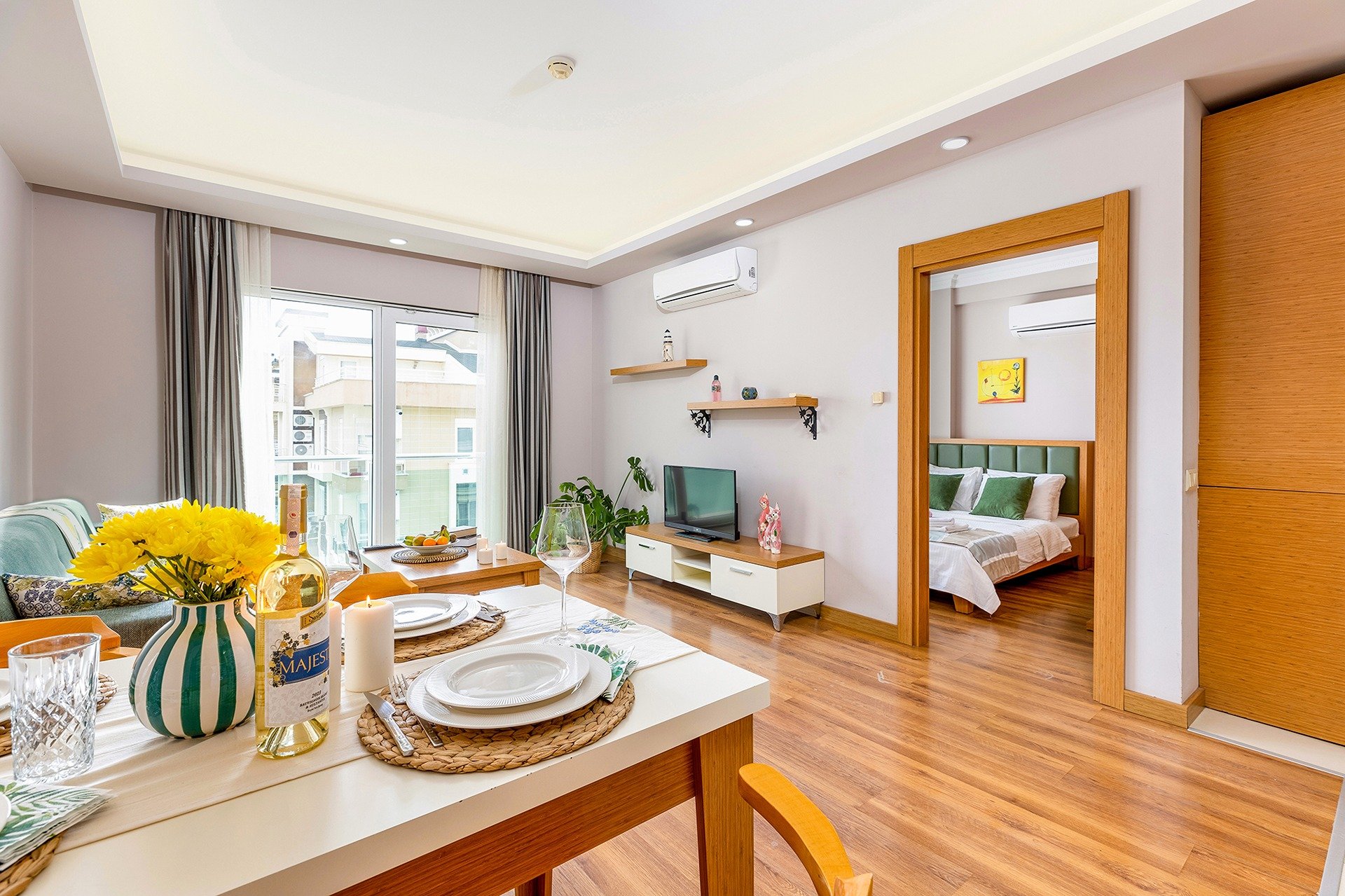 Geniş 1+1 Deluxe dairemiz, alanın ve yüksek konforun kıymetini bilen misafirlerimiz için mükemmel bir seçenektir. Dairede, rahat bir çift kişilik yatağın bulunduğu ayrı bir yatak odası, oturma alanı ve açılabilir kanepeyle donatılmış şık bir oturma odası, modern cihazlarla donatılmış geniş bir mutfak ve yemek alanı, ayrıca çamaşır makinesine sahip bir banyo bulunmaktadır. Standart 1+1 daireye göre daha geniş bir alana sahip olan bu daire, tatilde bile evinizdeymiş gibi hissetmenizi sağlar. Talep üzerine bir veya iki tek kişilik açılır yatak eklenebilir, bu daireyi çocuklu aileler için ideal bir seçenek haline getirir. İki yetişkin ve 13 yaşına kadar üç çocuk rahatça konaklayabilir. Ücretsiz Wi-Fi, klima, düz ekran televizyon ve bulaşık makinesi, mikrodalga fırın, elektrikli su ısıtıcısı gibi gerekli tüm mutfak eşyalarıyla size maksimum konfor sunuyoruz.
